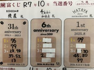 毎月恒例、富くじの当選番号の発表です。 ご当選された皆様、おめでとうございます! 当選番号は各店